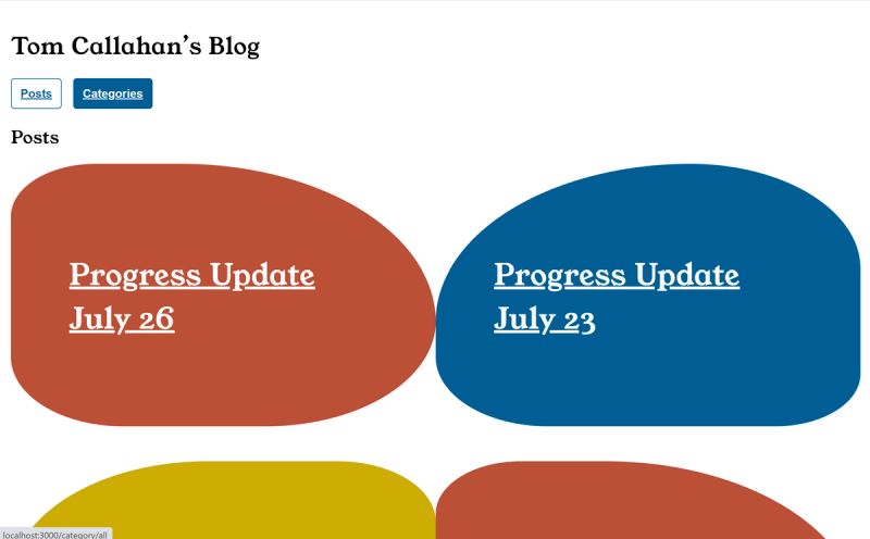 I've had a rough picture in my head for a while but I'm going straight to code with this so I've never put anything on "paper". What I'm picturing (and this is my entire design brief at this point) is something like a Calder sculpture—simple geometric shapes but with rounded corners, simple primary colors, and some sort of motion. My day job involves nothing but blue and square corners, so whatever it is it has to be a break from that.
